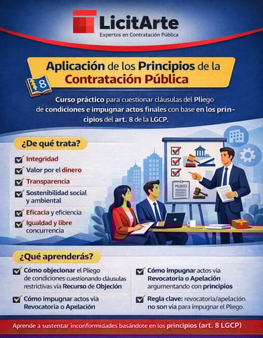 Curso orientado a comprender y usar de forma práctica los principios generales de la contratación pública del artículo 8 de la LGCP —integridad, valor por el dinero, transparencia, sostenibilidad social y ambiental, eficacia y eficiencia, igualdad y libre concurrencia, vigencia tecnológica, mutabilidad del contrato e intangibilidad patrimonial— como base para analizar decisiones y sustentar impugnaciones.