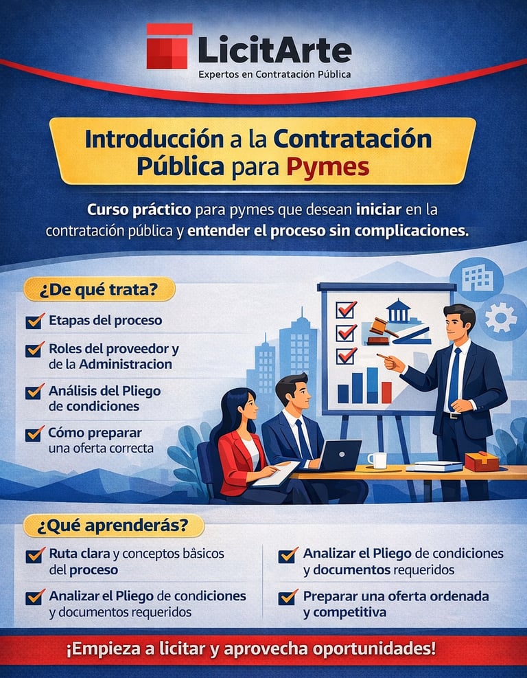 Curso diseñado para pymes que desean iniciar en la contratación pública y entender el proceso sin complicaciones, con enfoque práctico para participar correctamente desde el inicio.